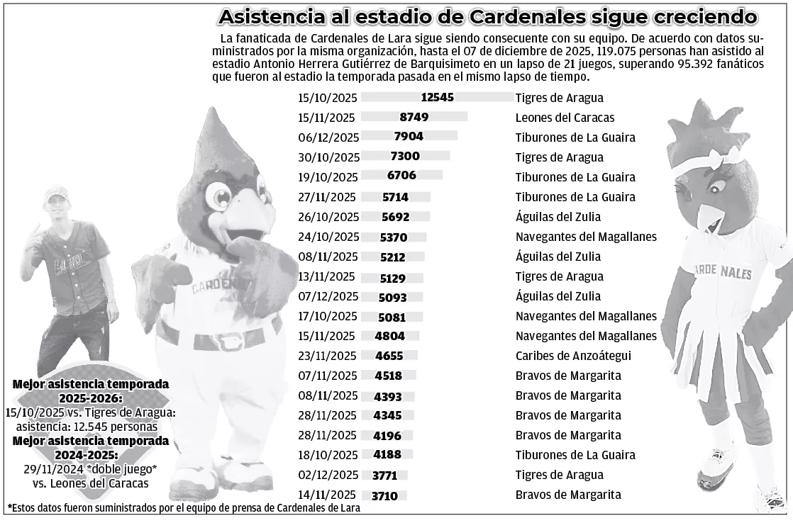 Cardenales de Lara ha crecido exponencialmente en la asistencia de fanáticos al estadio, a pesar de estar en una situación deportiva comprometida. De acuerdo con la investigación realizada, para el 07 de diciembre de 2024 el equipo larense ocupaba el primer lugar en la temporada regular con un récord de 26 victorias y 18 derrotas, mientras que para el 07 de diciembre de 2025 el equipo larense tenía registro de 22 victorias y 22 derrotas, lo que ubicaba a la novena crepuscular en el quinto lugar de la tabla de posiciones, a tres juegos de diferencia de la cima.