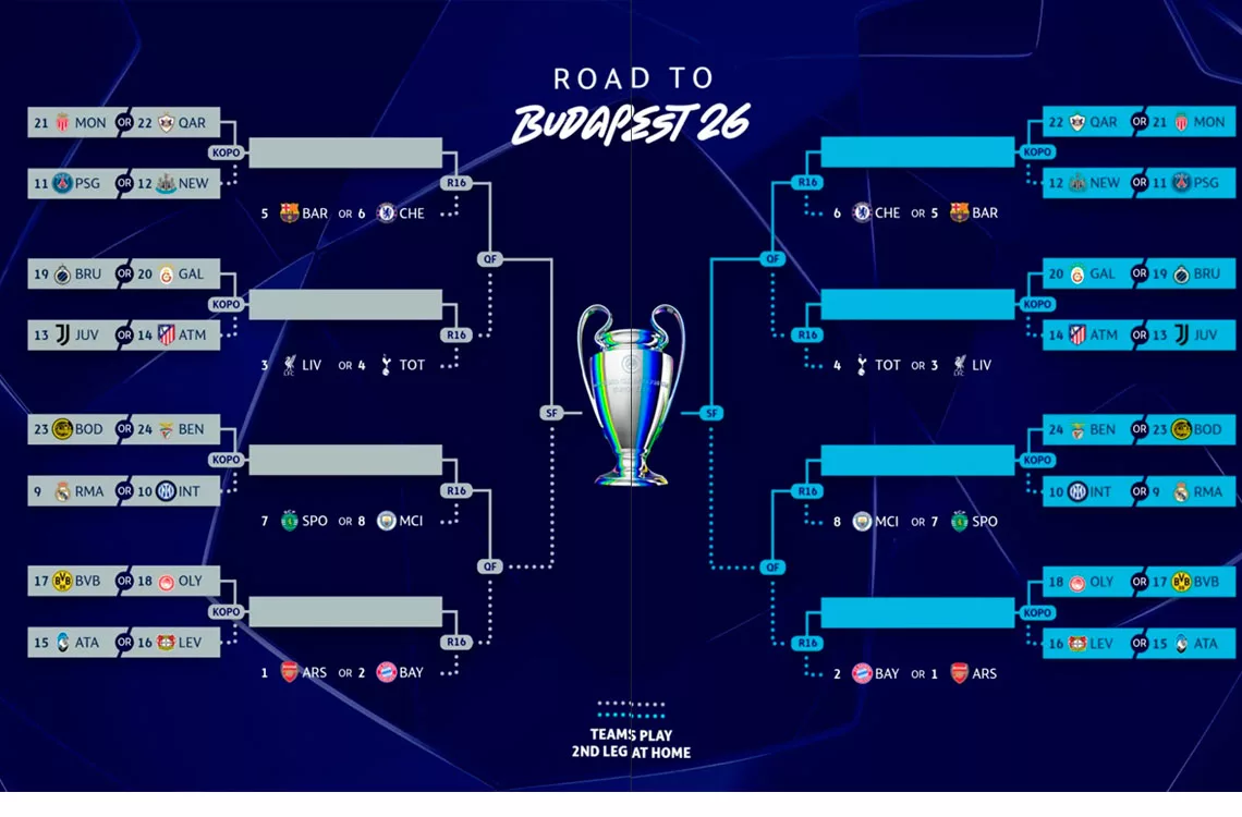 Los ocho clubes que accedieron directamente a octavos son: Arsenal, Bayern Múnich, Liverpool, Tottenham, Barcelona, Chelsea, Sporting de Lisboa y Manchester City.