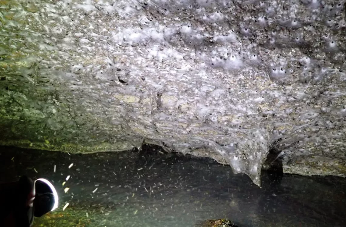 El sitio exacto del descubrimiento es la Cueva del Azufre, un ecosistema subterráneo cuya formación se debe a la acción del ácido sulfúrico derivado de la oxidación del sulfuro de hidrógeno en el agua subterránea. En este ambiente de condiciones extremas, los investigadores se encontraron con una maraña gigante de hilos entrelazados que cubre una superficie de aproximadamente 106 metros cuadrados, a lo largo de un pasaje angosto y sin luz.