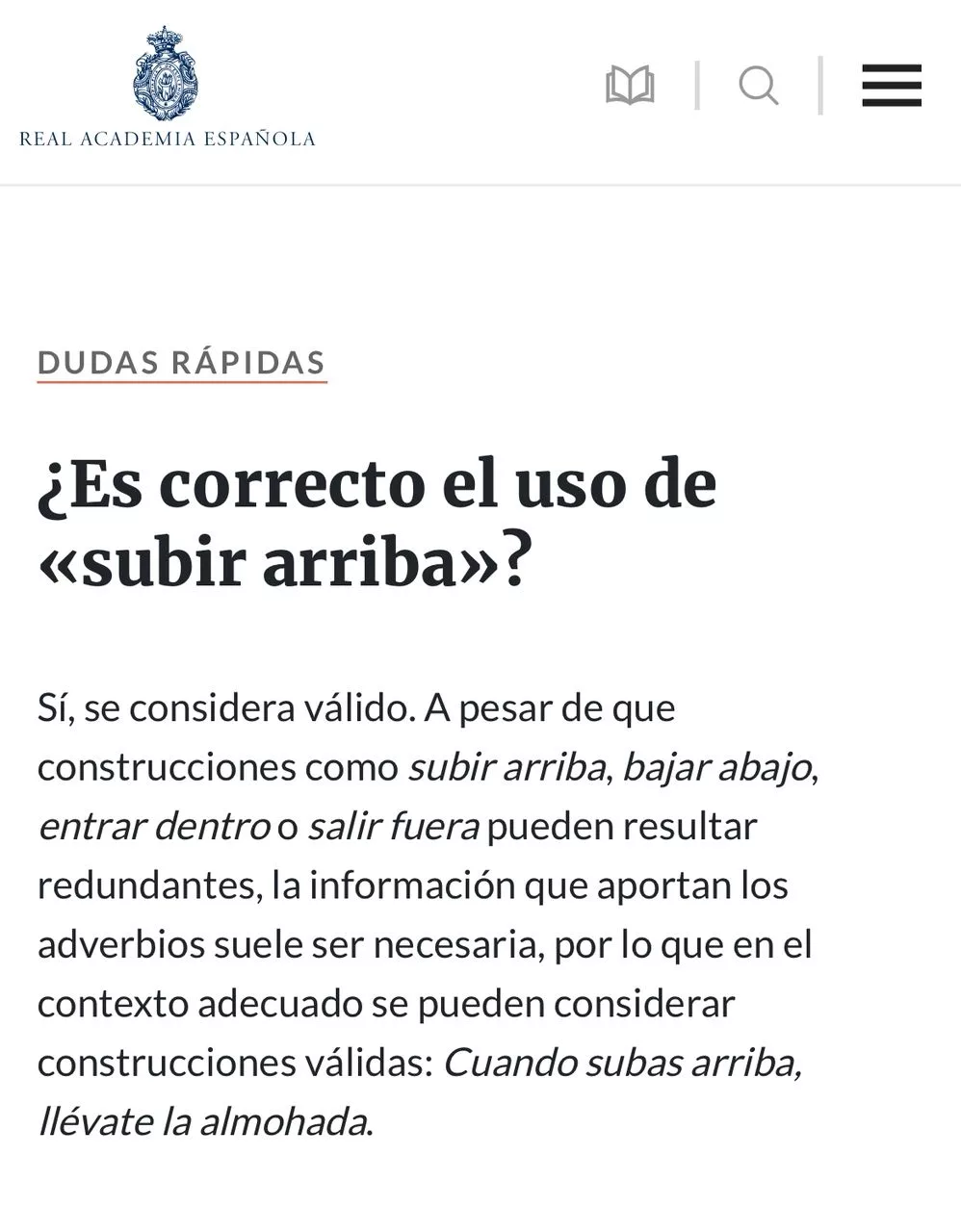 La Real Academia Española, a través de su sección de «dudas lingüísticas«, explicó que: «la información que aportan los adverbios suele ser necesaria, por lo que en el contexto adecuado se pueden considerar construcciones válidas: Cuando subas arriba, llévate la almohada«.