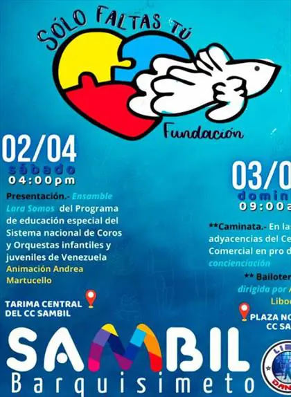 El punto de encuentro será el Centro Comercial Sambil, ubicado en el este de Barquisimeto. La primera actividad se llevará a cabo el sábado dos de abril, a las 4:00 P.M. Desde la tarima central del C.C., los asistentes podrán disfrutar de la presentación de Ensamble Lara Somos del programa de educación especial del Sistema Nacional de Coros y Orquestas Infantiles y Juveniles de Venezuela . La actividad contará con la animación de Andrea Martucello.