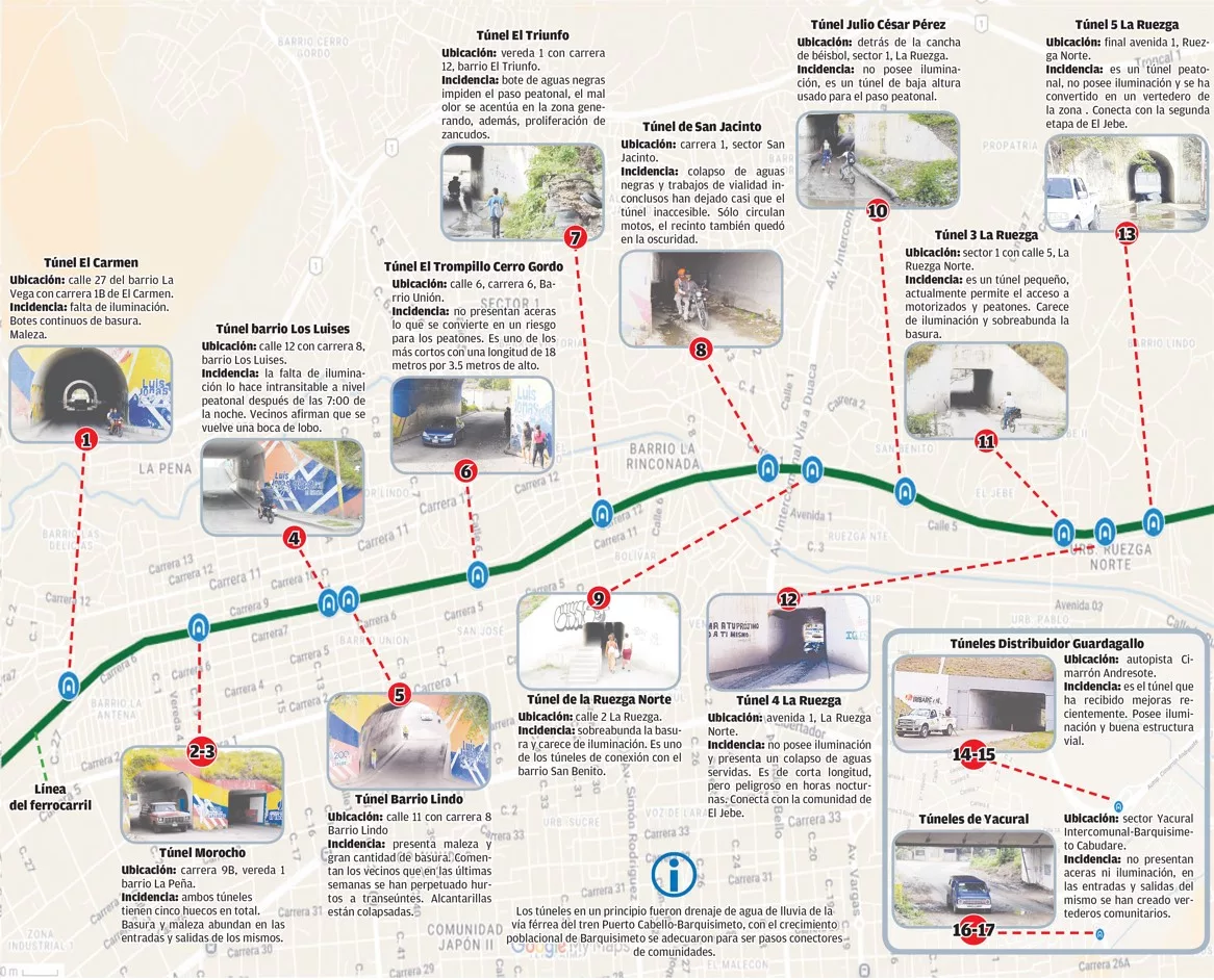 En un recorrido llevado a cabo por LA PRENSA, Diario de Lara, por estos corredores, personas que residen cerca de los túneles manifestaron su preocupación porque muestran deterioros que afectan «la seguridad y el buen vivir» en la zona. Tal es el caso del Túnel El Carmen – La Vega, considerado el más largo de Barquisimeto, con una longitud que supera los 100 metros y cuya construcción data de la década de los 60. Comentan los habitantes de la zona que en las noches se convierte en una boca de lobo por la oscuridad en su interior.