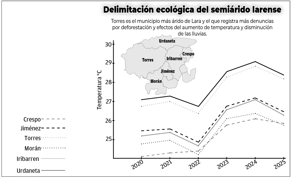 Lo que más preocupa a los estudiosos del ambiente, es lo que sucede en el municipio Torres, en donde habitan más de 221 mil personas (10,27% de la población de Lara). Es la jurisdicción más semiárida y producto a la deforestación de árboles como la vera, curarí y cují por décadas, para producir carbón vegetal ilegalmente, vendido en mercados internacionales, la población registra un aumento de la temperatura y una disminución de las lluvias de -133.5 milímetros de precipitación acumulada (mmP), de 1979 a 2024.
