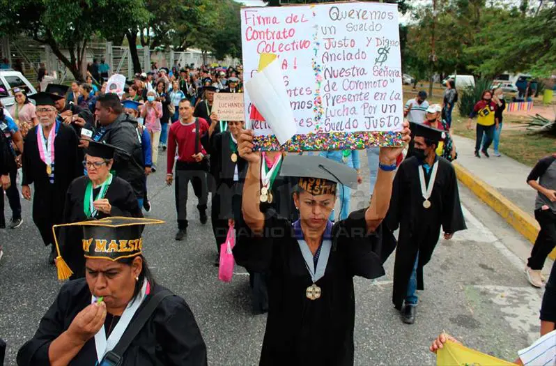 Lorena Rojas | LA PRENSA DE LARA.- Llevando un símbolo que en su momento fue una gran alegría porque representaba haber aprobado la carga académica, docentes marcharon con sus togas, birretes y medallas desde la Universidad Pedagógica Experimental Libertador (UPEL) sede este, hasta la Zona Educativa al cumplir un mes de acciones en las calles exigiendo un salario justo y los beneficios laborales.