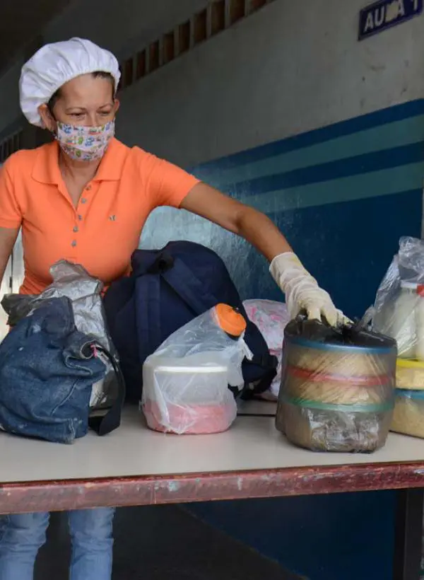 Dilyalis Ollarves, coordinadora de las madres procesadoras en la Unidad Educativa Carmen Fernández de Leoni, asegura que han cumplido con todas las normas de aseo y protección ante el Covid-19, siendo que usan tapabocas y guantes; cada representante lleva su envase para comida y una sola madre es quien recibe y entrega.