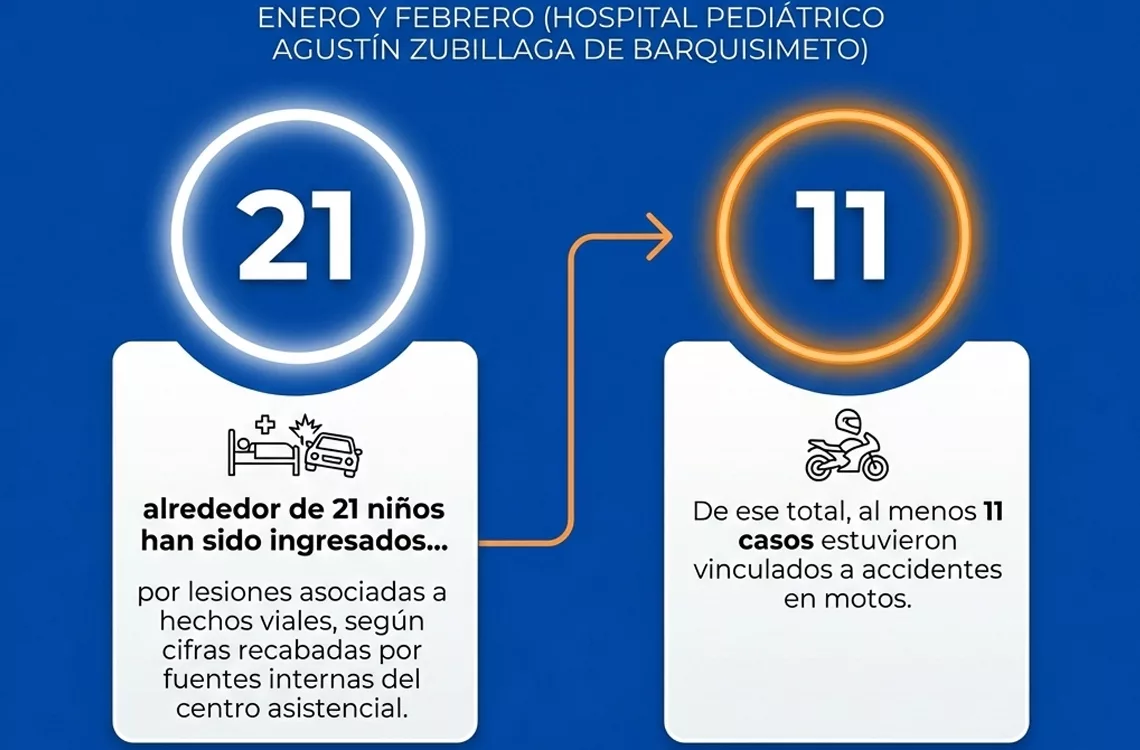 Entre enero y febrero de este año, alrededor de 21 niños han sido ingresados al Hospital Pediátrico Agustín Zubillaga de Barquisimeto por lesiones asociadas a hechos viales, según cifras recabadas por fuentes internas del centro asistencial. De ese total, al menos 11 casos estuvieron vinculados a accidentes en motos.