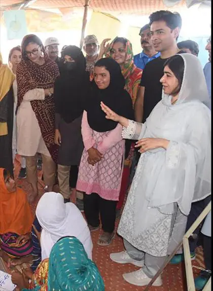 Yousafzai visitó campamentos en la zona rural de la provincia de Sind donde se reunió con mujeres que huyeron de sus aldeas tras quedar sumergidas por el agua, a quienes describió como personas «muy valientes», según un comunicado difundido por el despacho de la autoridad ministerial de la provincia.