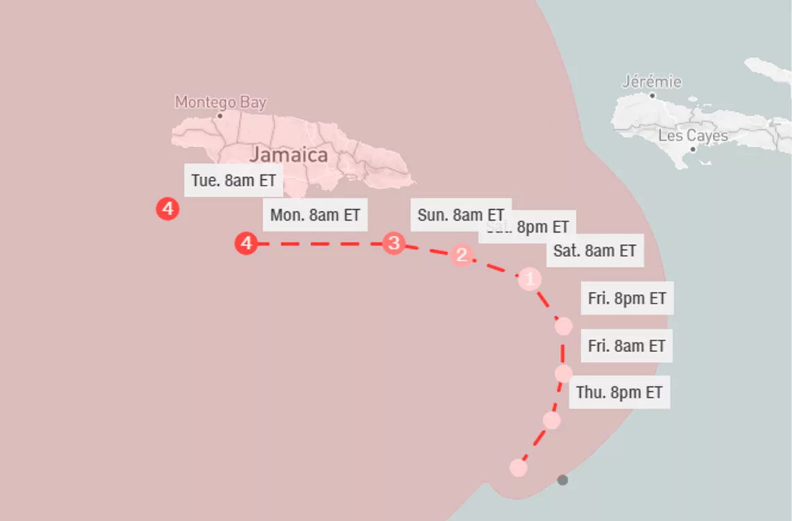 Si bien el impacto directo sobre el territorio continental de Estados Unidos parece poco probable, la costa este podría verse afectada por fuerte oleaje y peligrosas corrientes de resaca la próxima semana. Los expertos consideran dos escenarios principales para el giro de la tormenta: si se curva hacia el norte más lento de lo esperado, podría inclinarse hacia el este de Cuba o las Bahamas antes de salir al Atlántico; sin embargo, existe la posibilidad, aunque pequeña, de que gire bruscamente hacia el norte y se dirija directamente a Haití, causando impactos altamente concentrados y lluvias torrenciales en República Dominicana.