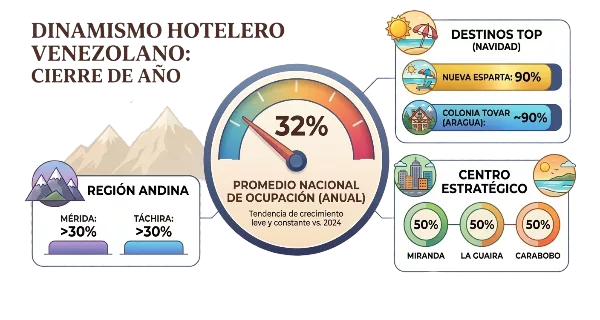 Por su parte, la región andina presenta un comportamiento más conservador en el flujo de visitantes. Los estados Mérida y Táchira reportan una ocupación que supera ligeramente el 30%. Aunque estas cifras son menores en comparación con el oriente o el centro del país, el gremio hotelero sigue monitoreando el comportamiento de los viajeros hacia estas zonas de montaña.