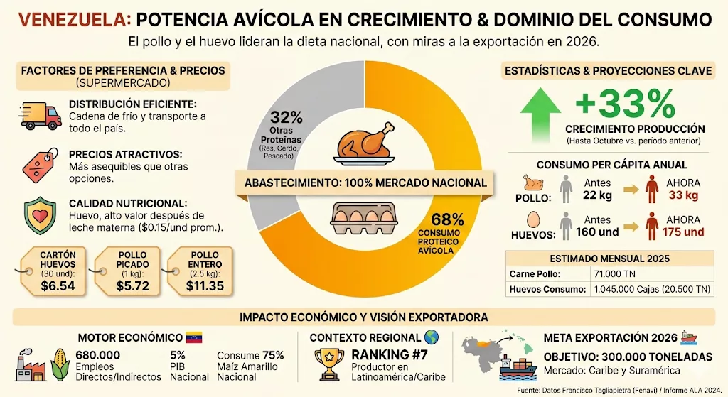 El venezolano está consumiendo más carne de pollo y huevos en su dieta diaria que la cantidad de proteína de res, cerdo, lácteos y pescado, así lo indicó Francisco Tagliapietra, presidente de la Federación Nacional de Avicultura de Venezuela (Fenavi), quien asegura que el 68% de las proteínas que come la población son del sector avícola que abastece el 100% del mercado nacional. La industria tiene capacidad instalada para comercializar en el Caribe y Suramérica 300 mil toneladas de pollo si llegaran a concentrarse rutas de exportación en 2026.
