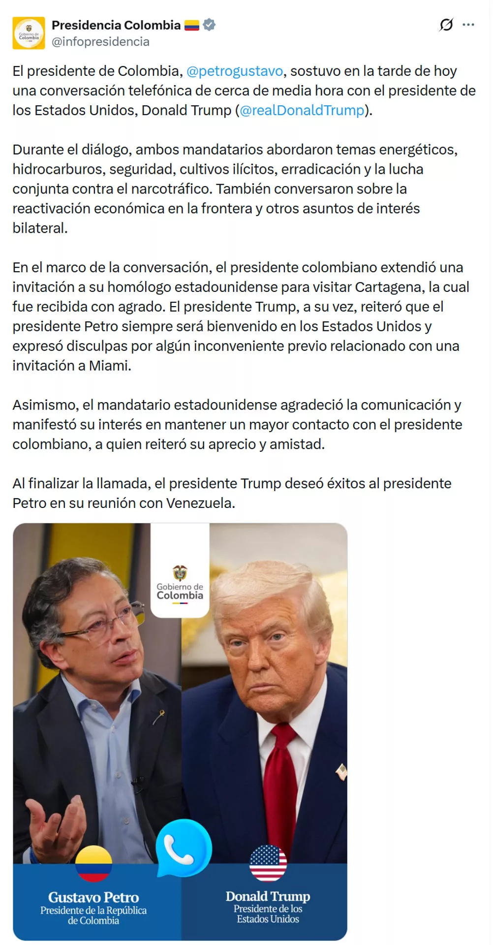 Además del respaldo político, la comunicación entre Bogotá y Washington abordó temas críticos como la erradicación de cultivos ilícitos, la lucha contra el narcotráfico y la cooperación en materia de hidrocarburos. Trump reiteró que Petro «siempre será bienvenido» en Estados Unidos, subrayando la importancia de la reactivación económica en las zonas fronterizas entre Colombia y Venezuela como un factor de estabilidad para la región.