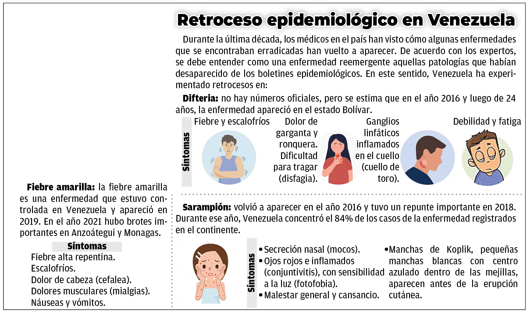 La difteria no fue la única enfermedad que apareció en 2016. Los reportes nacionales indican que, para esa fecha, también fueron diagnosticados los primeros casos de sarampión en el país. Curiosamente, ese mismo año América fue declarado por la OMS como territorio libre de la enfermedad.