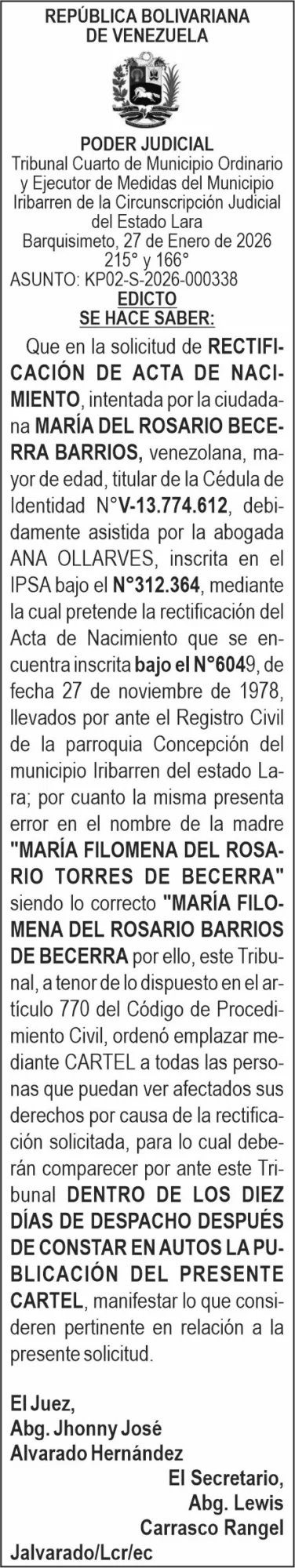 PublicidadAVISOS, EDICTOS Y REGISTROSPor Redacción La Prensa de Lara- octubre 18, 2024FacebookTwitterWhatsAppTelegram REGISTROSSimplifica la gestión de tus archivos legales con nuestro portal. Publica, consulta y comparte tus documentos de forma rápida y seguraTRIPLE POPULARCHAO JEFECHANCE EN LINEAEDICTOSAviso 12-01-26aviso 16-01-26 Aviso 11-02-26Aviso 13-01-26Aviso 13-01-26Aviso 13-01-26Aviso 09-01-26 EtiquetasavisosedictosPublicidadFacebookTwitterWhatsAppTelegram Noticias relacionadasPOLÍTICAS DE SEGURIDAD APP LA PRENSA DE LARA noviembre 24, 2025 No te pierdas DeportesVenezuela disputará la final de la Serie de las Américas ante Colombia Massiel Quero - febrero 13, 2026 Con una ofensiva de 17 hits, Venezuela venció 9-1 a Cuba y avanzó a la final de la Serie de las Américas, donde se enfrentará a Colombia por el título.Asamblea Nacional difiere la segunda discusión sobre el proyecto de la Ley de Amnistía febrero 13, 2026 Hombre es buscado por robar el arma de un funcionario de la PNB febrero 13, 2026 Iribarren se lleva la corona: Aura Croce es la nueva Reina del Carnaval Lara 2026 febrero 13, 2026 Redes socialesFacebookInstagramTelegram YoutubeWhatsapp