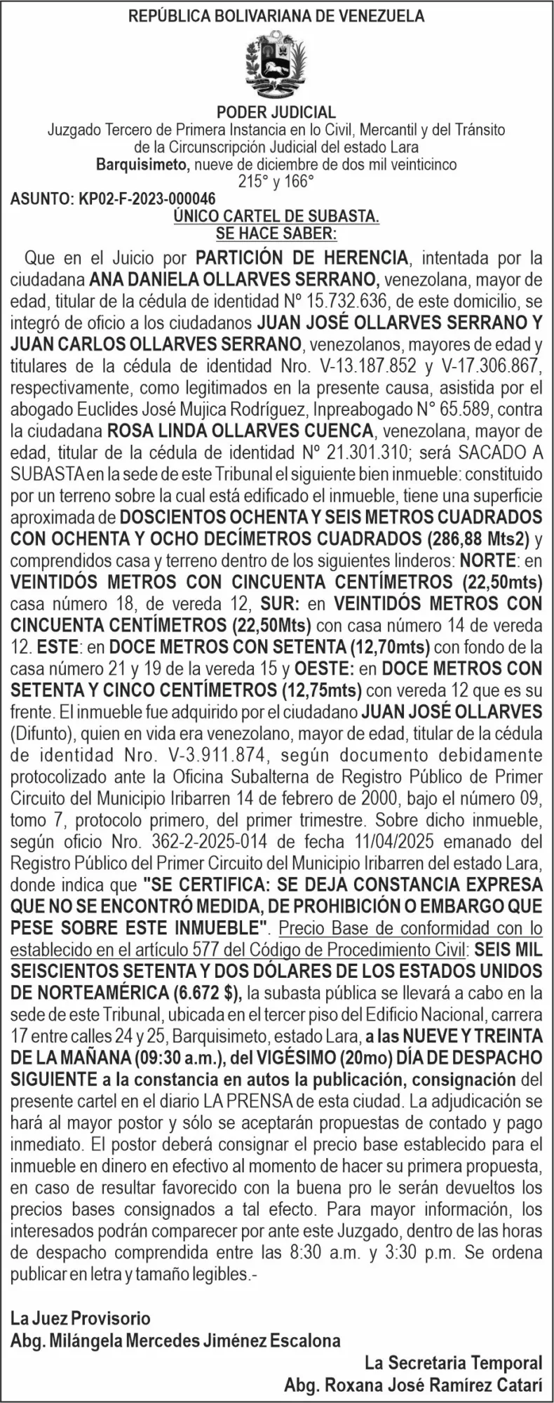 PublicidadAVISOS, EDICTOS Y REGISTROSPor Redacción La Prensa de Lara- octubre 18, 2024FacebookTwitterWhatsAppTelegram REGISTROSSimplifica la gestión de tus archivos legales con nuestro portal. Publica, consulta y comparte tus documentos de forma rápida y seguraTRIPLE POPULARCHAO JEFECHANCE EN LINEAEDICTOSconvocatoria 12-11-25Aviso 09-01-26 EtiquetasavisosedictosPublicidadFacebookTwitterWhatsAppTelegram Noticias relacionadasPOLÍTICAS DE SEGURIDAD APP LA PRENSA DE LARA noviembre 24, 2025 No te pierdas MundoMás de 4.000 hectáreas destruidas y miles de evacuados por incendios forestales en la Patagonia argentina Massiel Quero - enero 9, 2026 Más de 4.000 hectáreas fueron arrasadas por los incendios fuera de control en la Comarca Andina.Divina Pastora: La historia de fe que eligió quedarse para siempre en el corazón de Lara enero 9, 2026 Accidentes de moto dejan dos víctimas fatales en El Tocuyo y Barquisimeto enero 9, 2026 Copa Airlines reanuda vuelos entre Panamá y Caracas a partir del 13-E enero 9, 2026 Redes socialesFacebookInstagramTelegram YoutubeWhatsapp