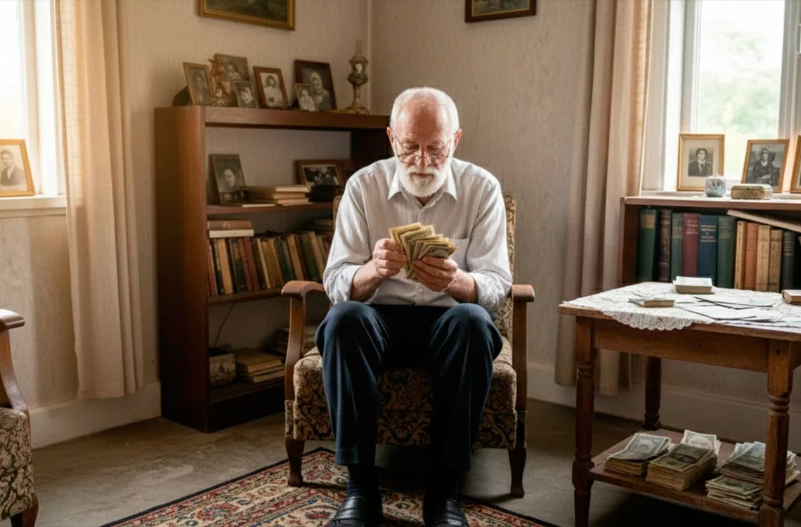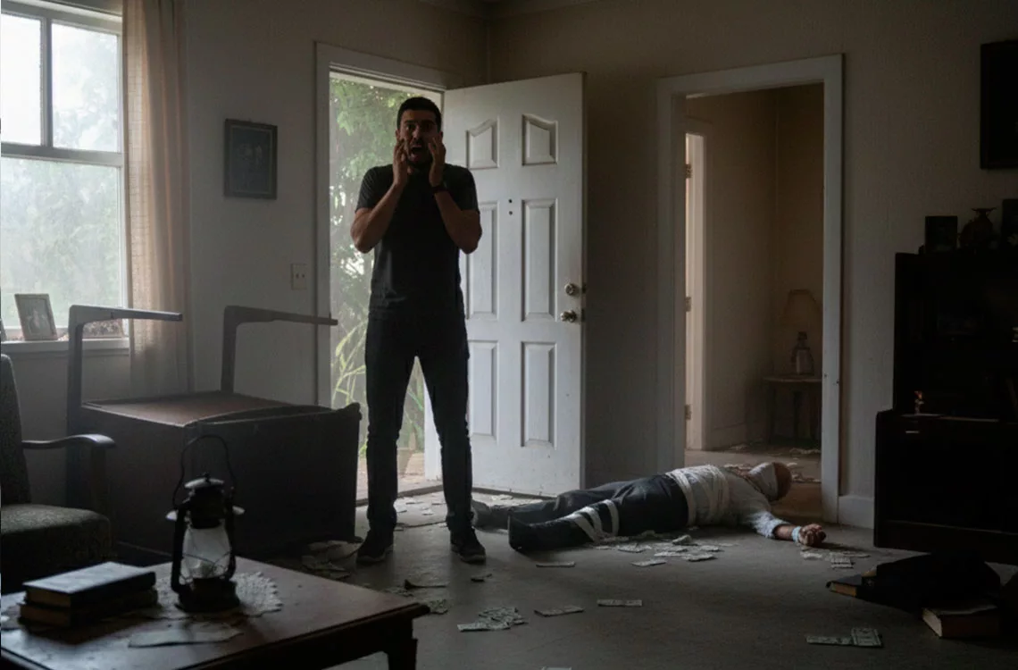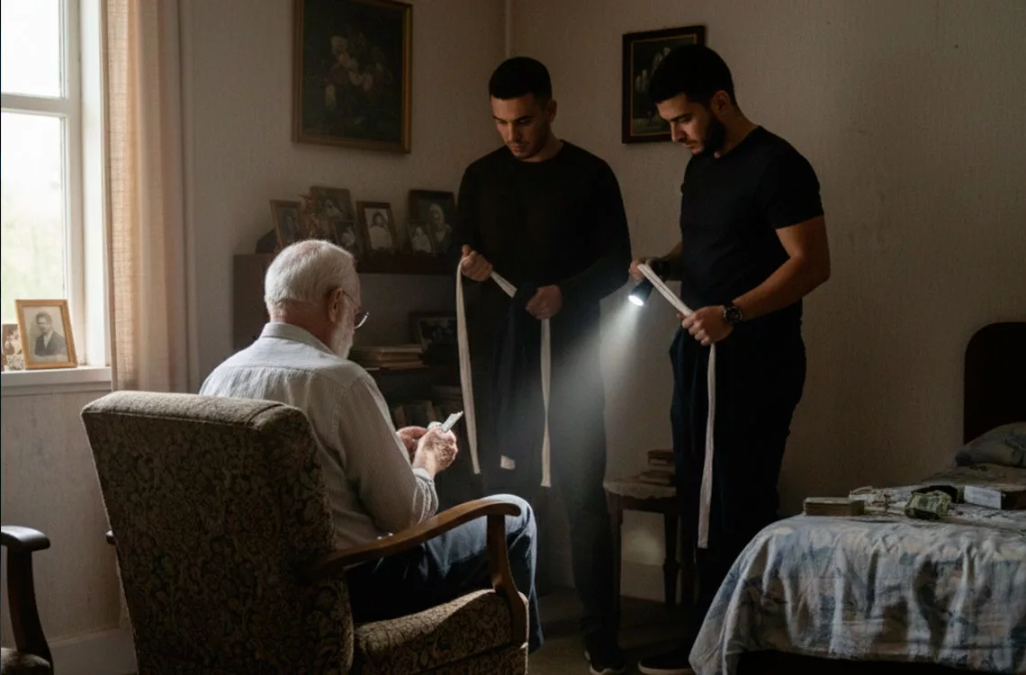 El prestamista con los ojos tapados no podía distinguir a los hombres que vinieron a robarle su dinero. Inmovilizado y silenciado, el abuelo fue objeto de una brutal golpiza para que dijera en qué lugar tenía escondido el dinero. El abuelo no quería hablar, sólo un delincuente se quedó en el cuarto de él, mientras que el otro hampón trataba de buscar algo de valor en la casa.